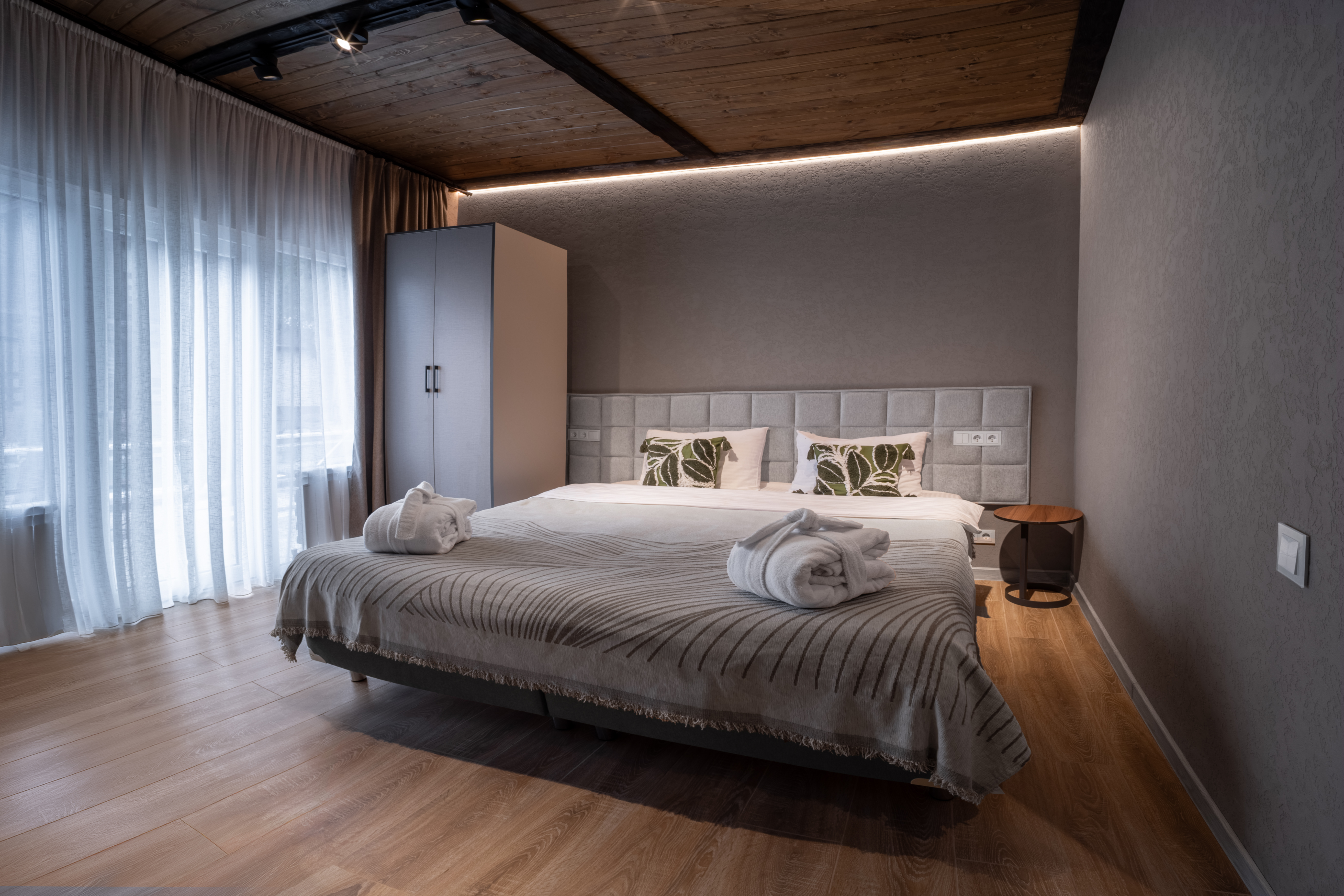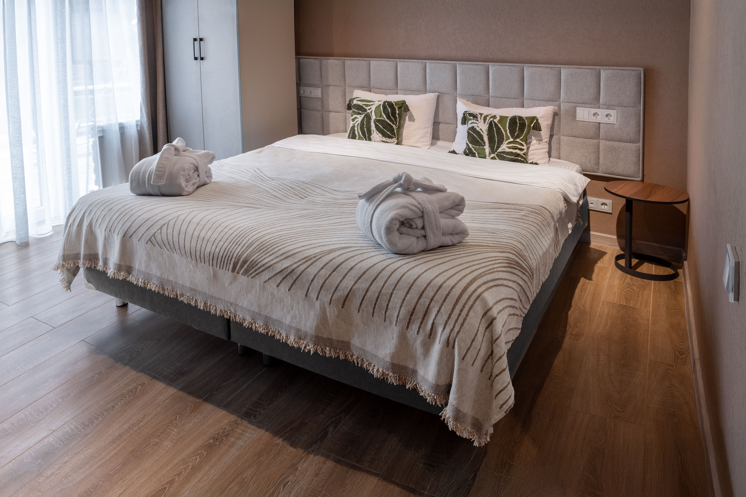 Две просторные спальни с кроватями на выбор Double/Twin удобными ортопедическими матрасами, идеальное пространство для отдыха и сна.